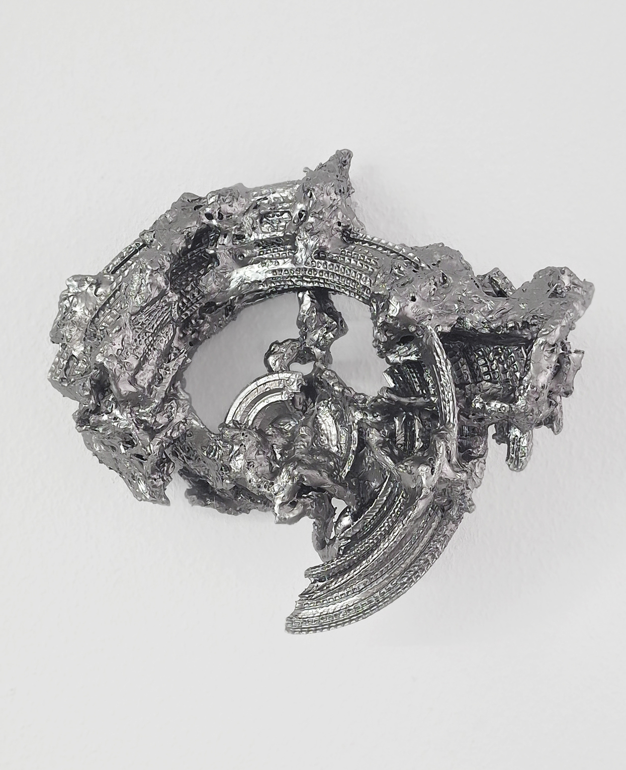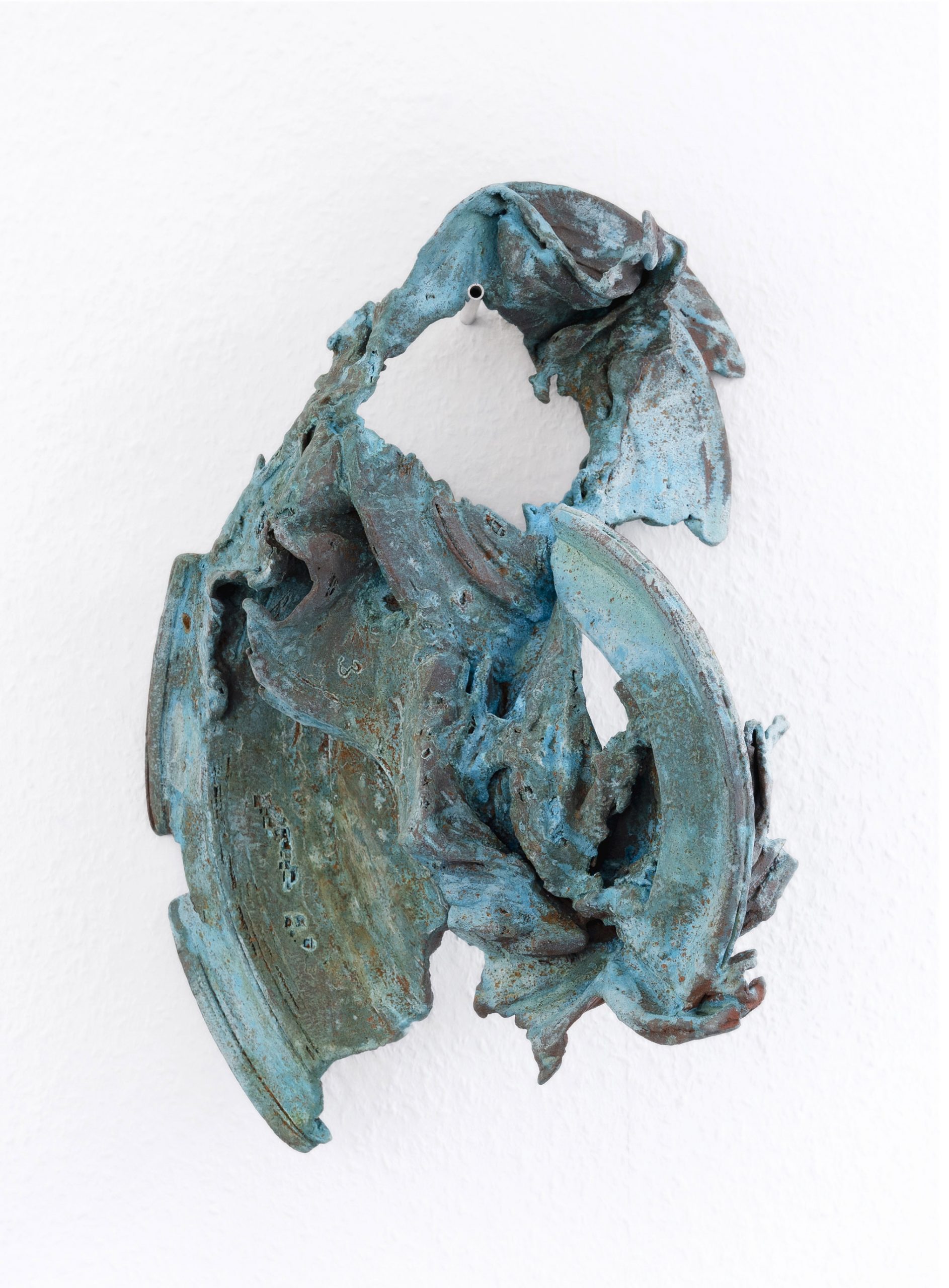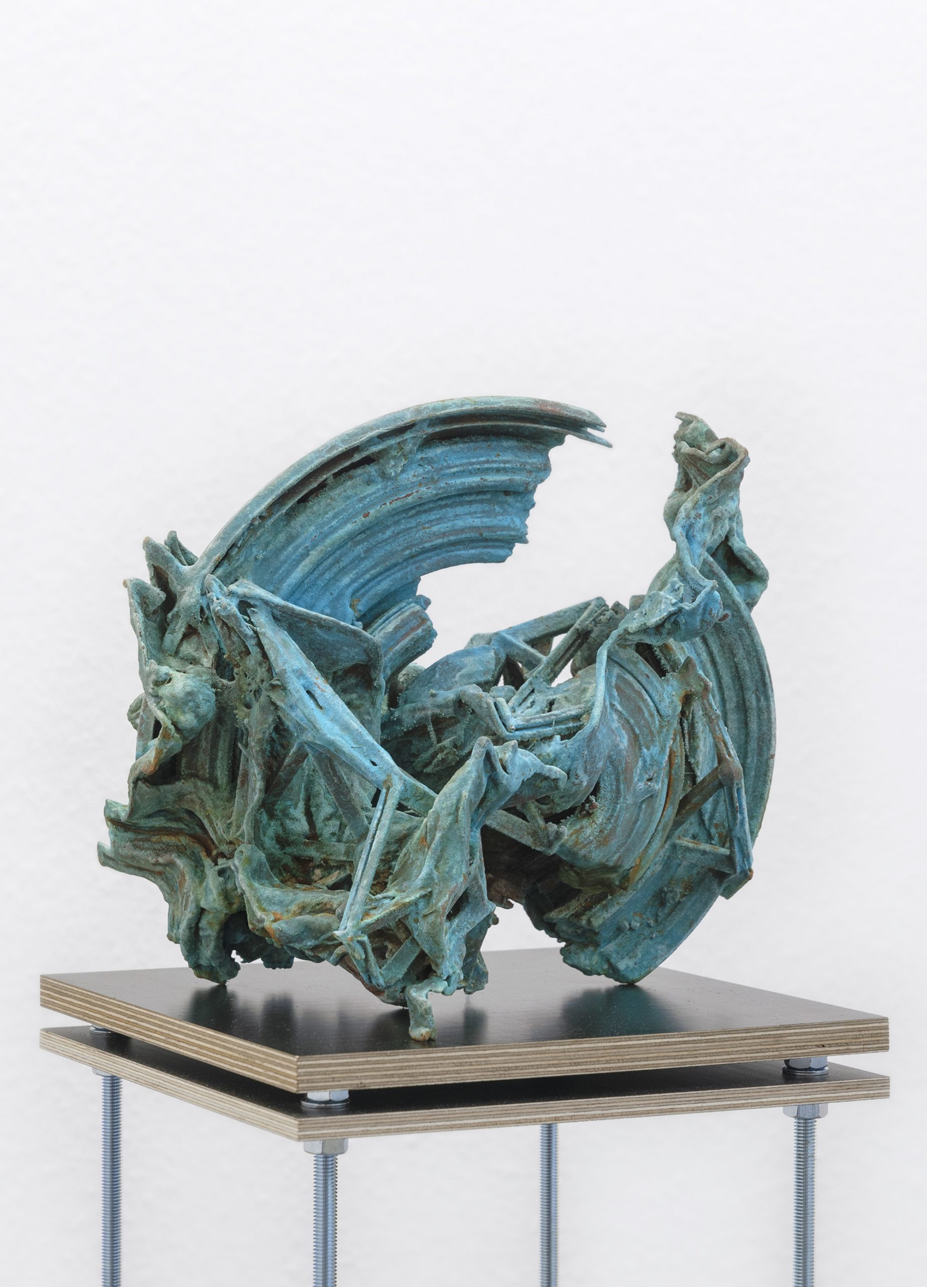 Auch die kleineren Objekte auf Sockeln entziehen sich klaren Grenzen. Obwohl sie kompakt erscheinen, lassen sie sich nicht als geschlossene Körper erfassen. Der Blick wird weitergetrieben. Über das Material hinaus. Es gibt Anklänge an Kreise oder Volumen. Doch auch diese werden immer wieder aufgebrochen. Zerstört. Geöffnet. Die Oberflächen erinnern an modellierten Schlamm. An zerdrückten, zusammengefügten Schrott. An Fragmente ohne ursprüngliche Form. Tatsächlich entstehen diese Arbeiten teils mit digitalen Werkzeugen, werden gegossen, bearbeitet, patiniert. Doch man erkennt diese Prozesse nicht. Das verstärkt ihre Unbestimmtheit. Man kann sie nicht eindeutig festlegen. Nicht materiell. Nicht formal. So erfahren wir auch hier die Auflösung der festen Form als Öffnung. Als Befreiung. Als Einladung an die Fantasie.