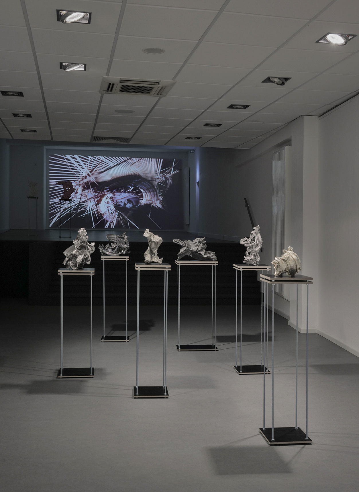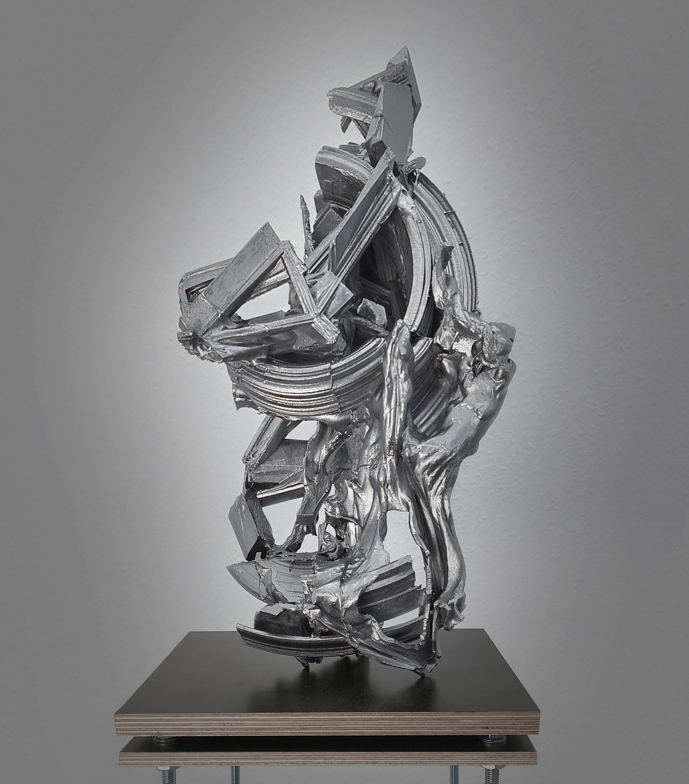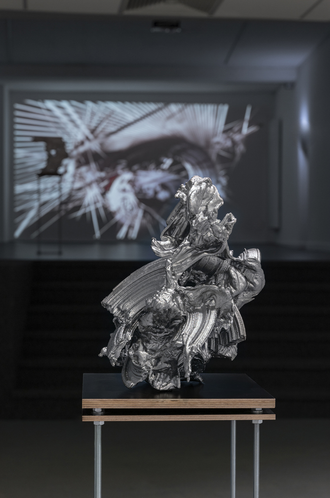 Auch die kleineren Objekte auf Sockeln entziehen sich klaren Grenzen. Obwohl sie kompakt erscheinen, lassen sie sich nicht als geschlossene Körper erfassen. Der Blick wird weitergetrieben. Über das Material hinaus. Es gibt Anklänge an Kreise oder Volumen. Doch auch diese werden immer wieder aufgebrochen. Zerstört. Geöffnet. Die Oberflächen erinnern an modellierten Schlamm. An zerdrückten, zusammengefügten Schrott. An Fragmente ohne ursprüngliche Form. Tatsächlich entstehen diese Arbeiten teils mit digitalen Werkzeugen, werden gegossen, bearbeitet, patiniert. Doch man erkennt diese Prozesse nicht. Das verstärkt ihre Unbestimmtheit. Man kann sie nicht eindeutig festlegen. Nicht materiell. Nicht formal. So erfahren wir auch hier die Auflösung der festen Form als Öffnung. Als Befreiung. Als Einladung an die Fantasie.