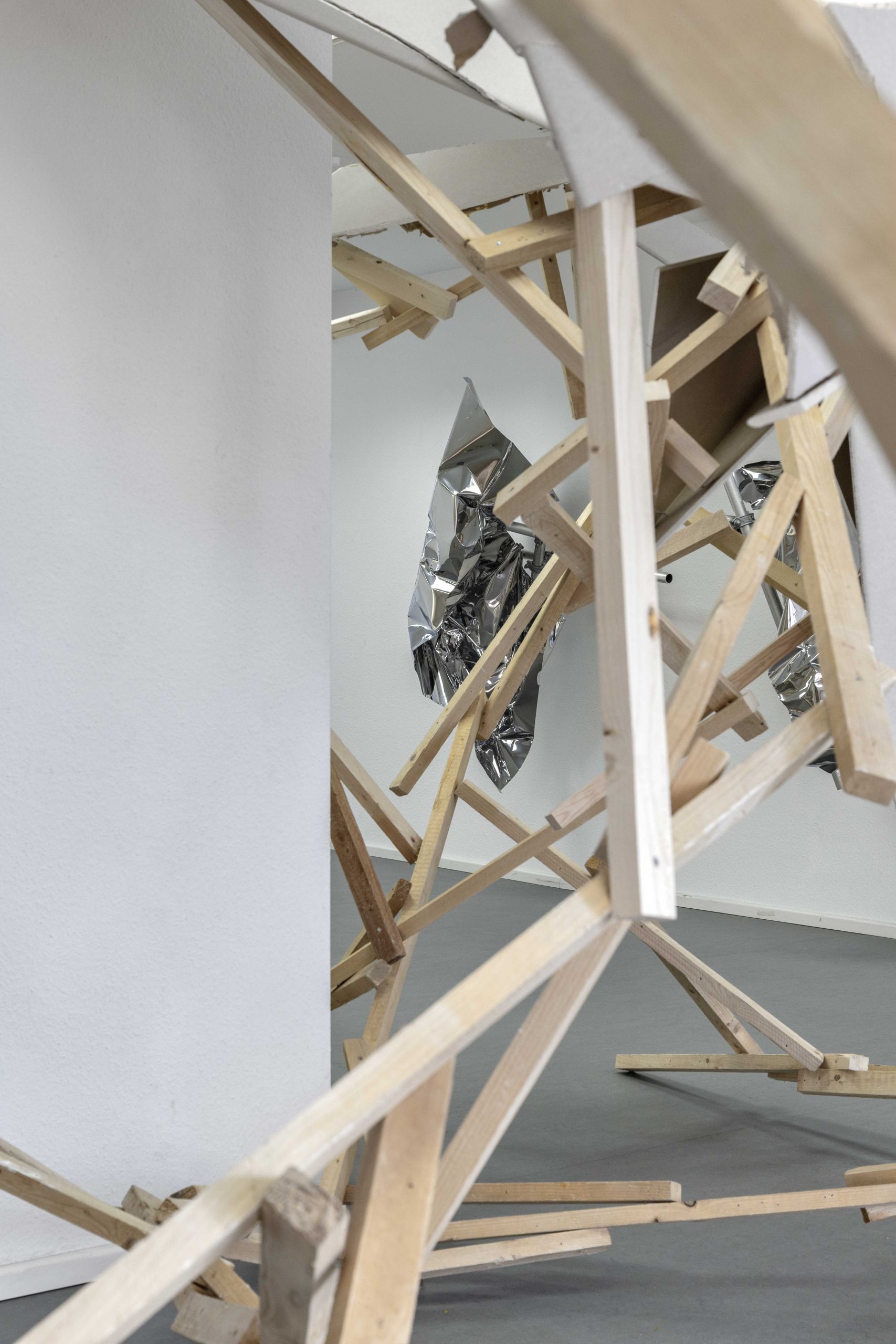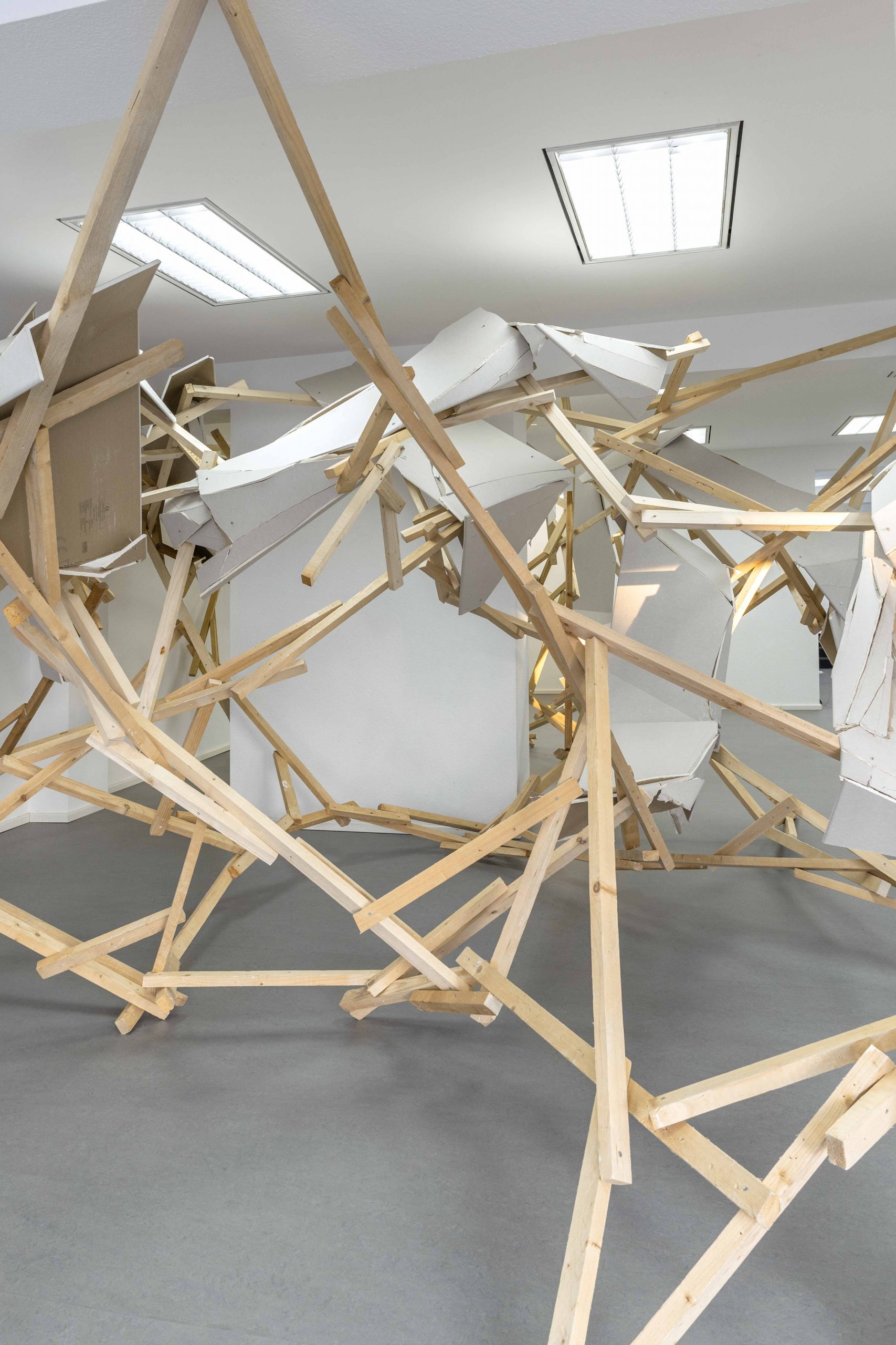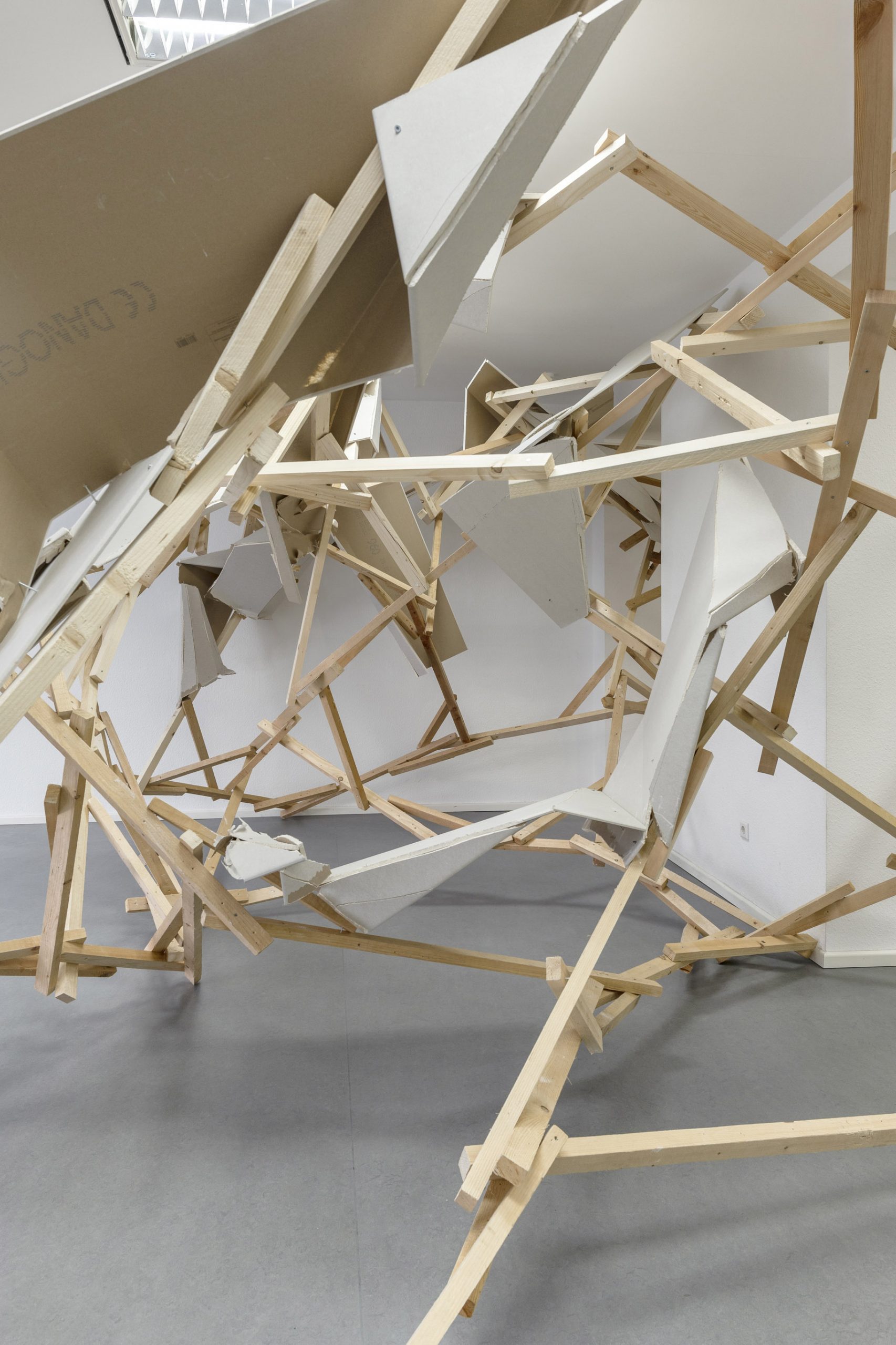 Wer der Arbeit „daydream structures“ begegnet, merkt sofort: Das Auge findet keinen Ruhepunkt. Es gibt keine klar abgegrenzte Form. Keine Mitte. Keine Vertikale oder Horizontale. Keine Richtung, an der man sich festhalten könnte. Die Installation aus Holzleisten und weißen, teils zerbrochenen Flächen breitet sich im Raum aus, ohne ihn eindeutig zu bestätigen. Sie zieht sich hinter Raumteiler zurück. Sie taucht auf und verschwindet wieder. Sie gehört nicht eindeutig in einen Raum. Vielmehr wirkt sie wie eine Abfolge von Teilen, die sich ihren eigenen Raum nimmt. Der Blick wird angezogen. Und er wird weitergeführt. Unaufhaltsam. Von Element zu Element. Ohne je bei einem stehen bleiben zu können. Einzelne Teile lassen sich nicht isolieren. Kaum hat man etwas erfasst, springt das Auge schon weiter. Verbindungenb brechen ab. Neue beginnen. Es gibt keine logische Reihenfolge. Kein Oben und Unten. Kein Vor und Zurück. Alles ist gleichwertig. So entsteht eine besondere Form von Bewegung. Der Blick schlingt sich durch den Raum. Er rast, stockt, setzt neu an. Er folgt keiner festen Bahn. Gerade Kanten sind da. Doch sie geben keine Orientierung. Stattdessen entstehen immer neue Kurven im Sehen. (Die Formen sind gerade, doch das Auge macht Kurven.) Ein Geflecht aus Reizen. Aus Unterbrechungen. Aus Übergängen. Trotz dieser Zersplitterung wirkt das Werk als Einheit. Nicht durch Form. Sondern durch Rhythmus. Durch Geschwindigkeit. Durch den intensiven Zusammenklang der Bewegungen. Es entsteht eine Art visuelles Ballett. Eine einheitliche Dissonanz. Alles scheint ohne feste Regeln in Bewegung. Und doch gehört alles zusammen.