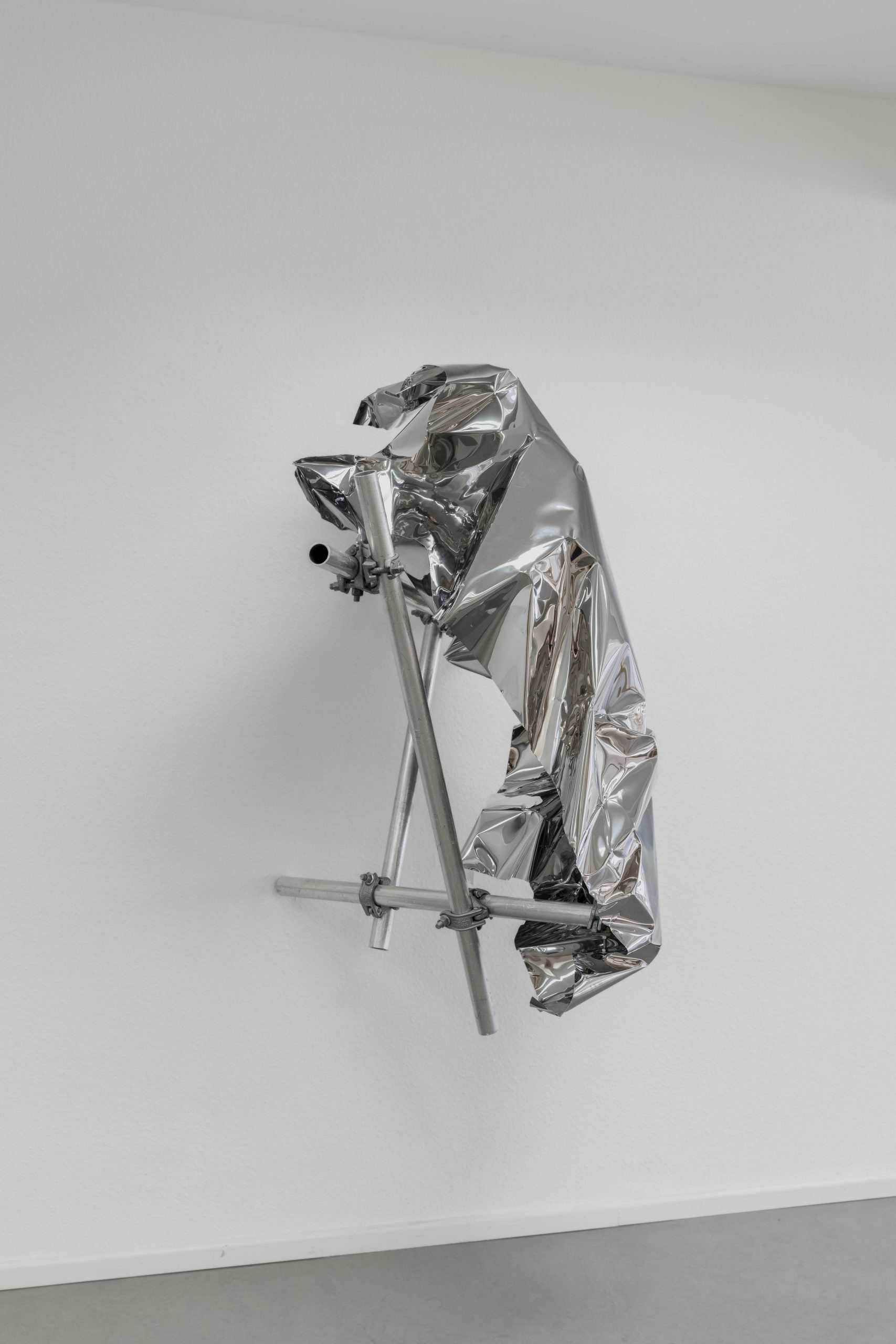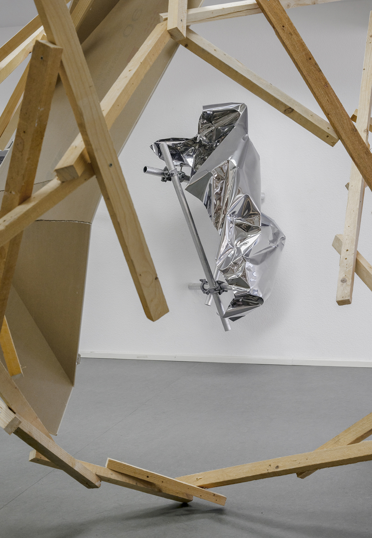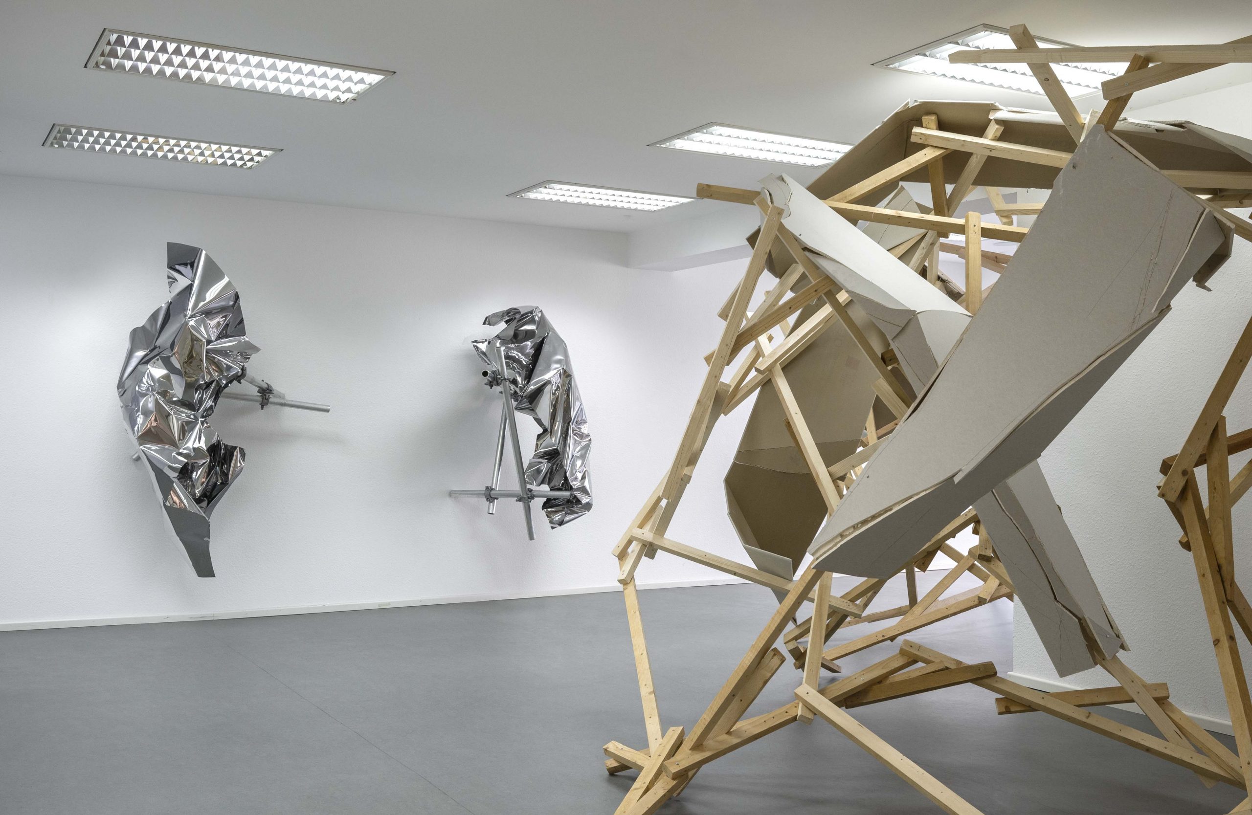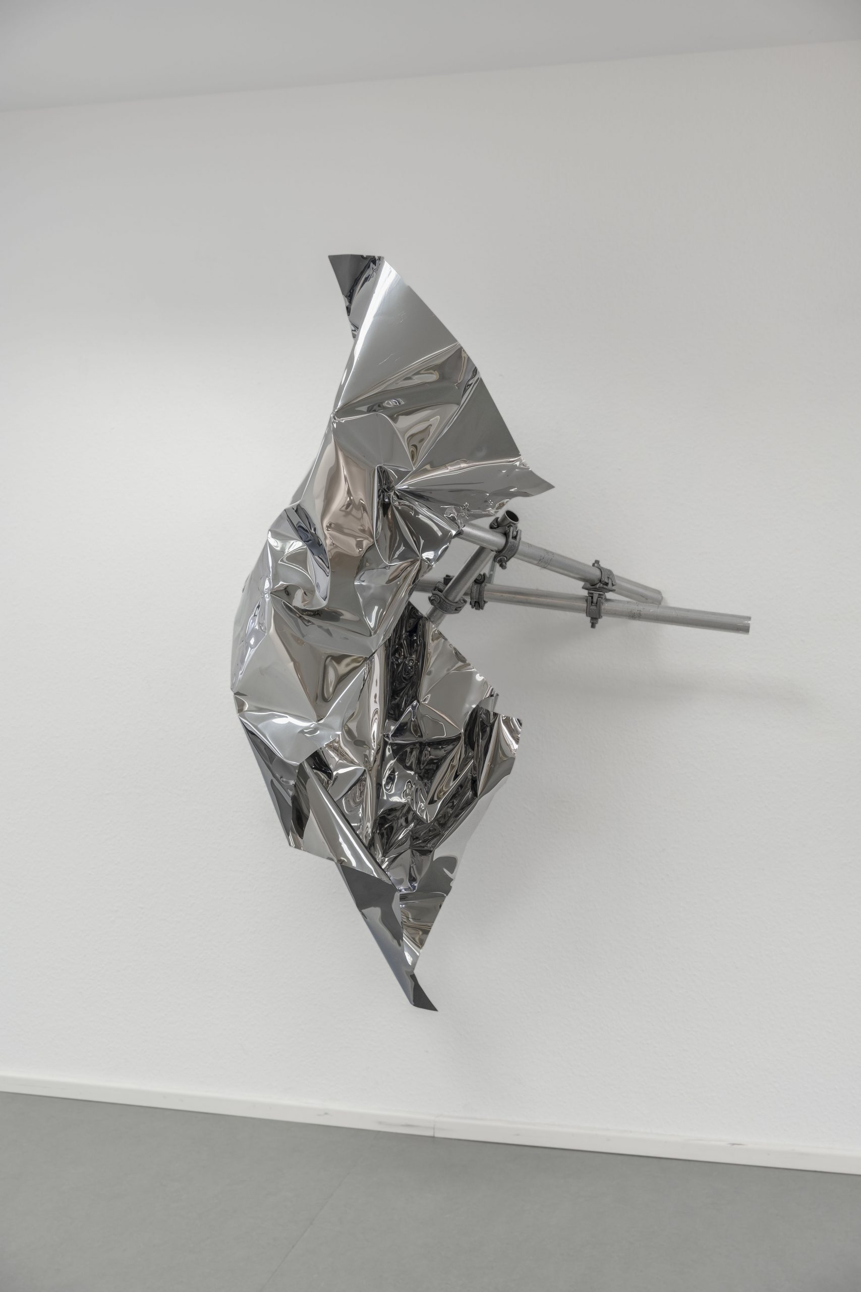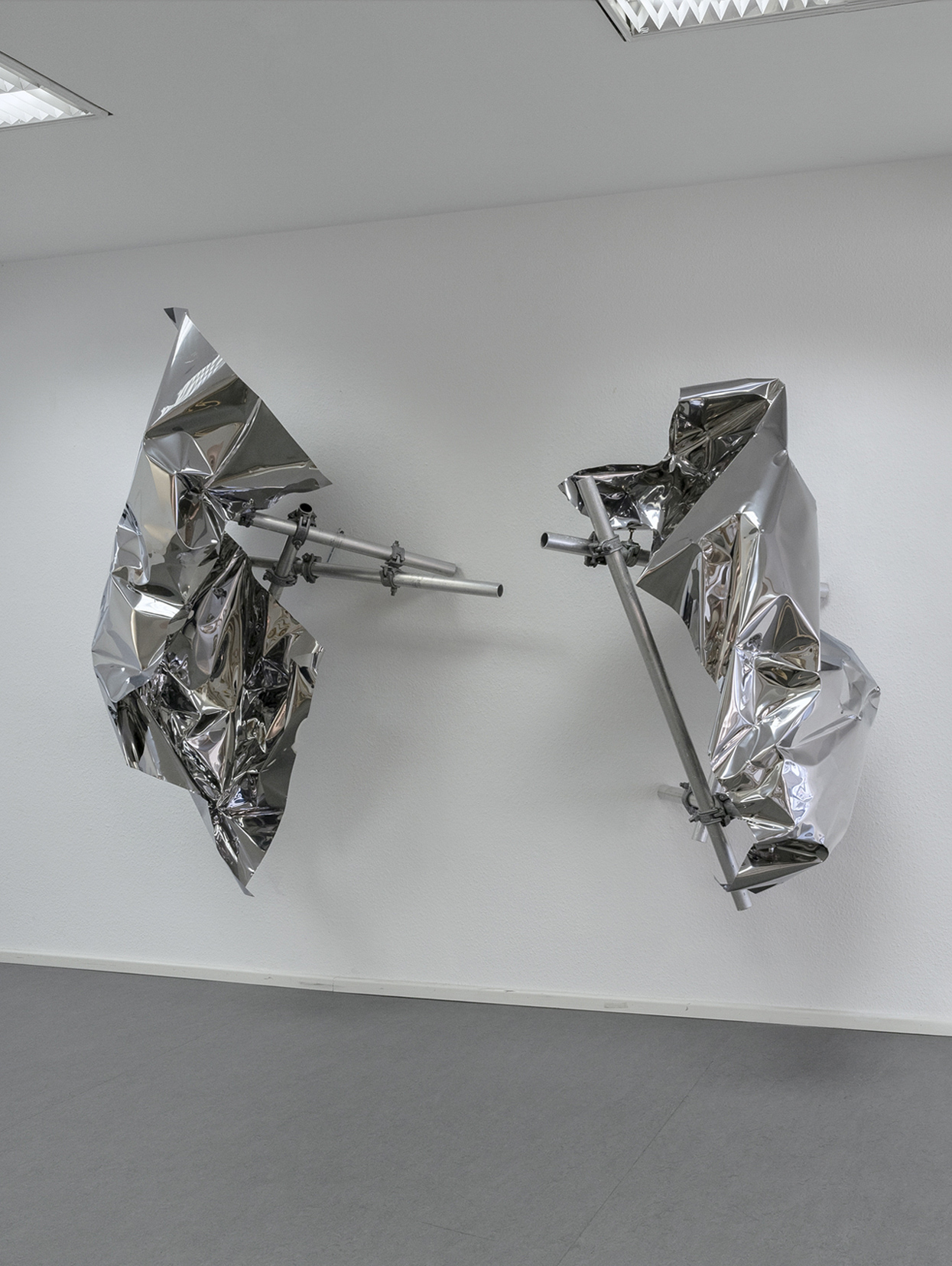 In der Ausstellung in Lippstadt tritt die Installation in einen intensiven Dialog mit weiteren Arbeiten im Raum. An den Wänden finden sich gebogene, spiegelpolierte Metallflächen auf verschraubten Metallröhren aus dem Gerüstbau. Eine dieser Wandarbeiten ist mit leuchtenden LED-Lichtern in gebogenem Acrylglas versehen. Auch hier gibt es keine festen Formen. Es sind Oberflächen, aber auch Linien aus Licht. Greifbar und zugleich immateriell. Sie ziehen den Blick sofort an. Zwischen den Wandarbeiten und der großen Installation entstehen lebhafte Beziehungen. Das Auge wandert. Es tanzt durch den Raum. Von Werk zu Werk. Der Rhythmus verändert sich. Die Richtungen ändern sich. Kurven treffen auf Brüche. Schrägen auf Schwünge. Nichts ist starr. Alles scheint in Ausdehnung begriffen.